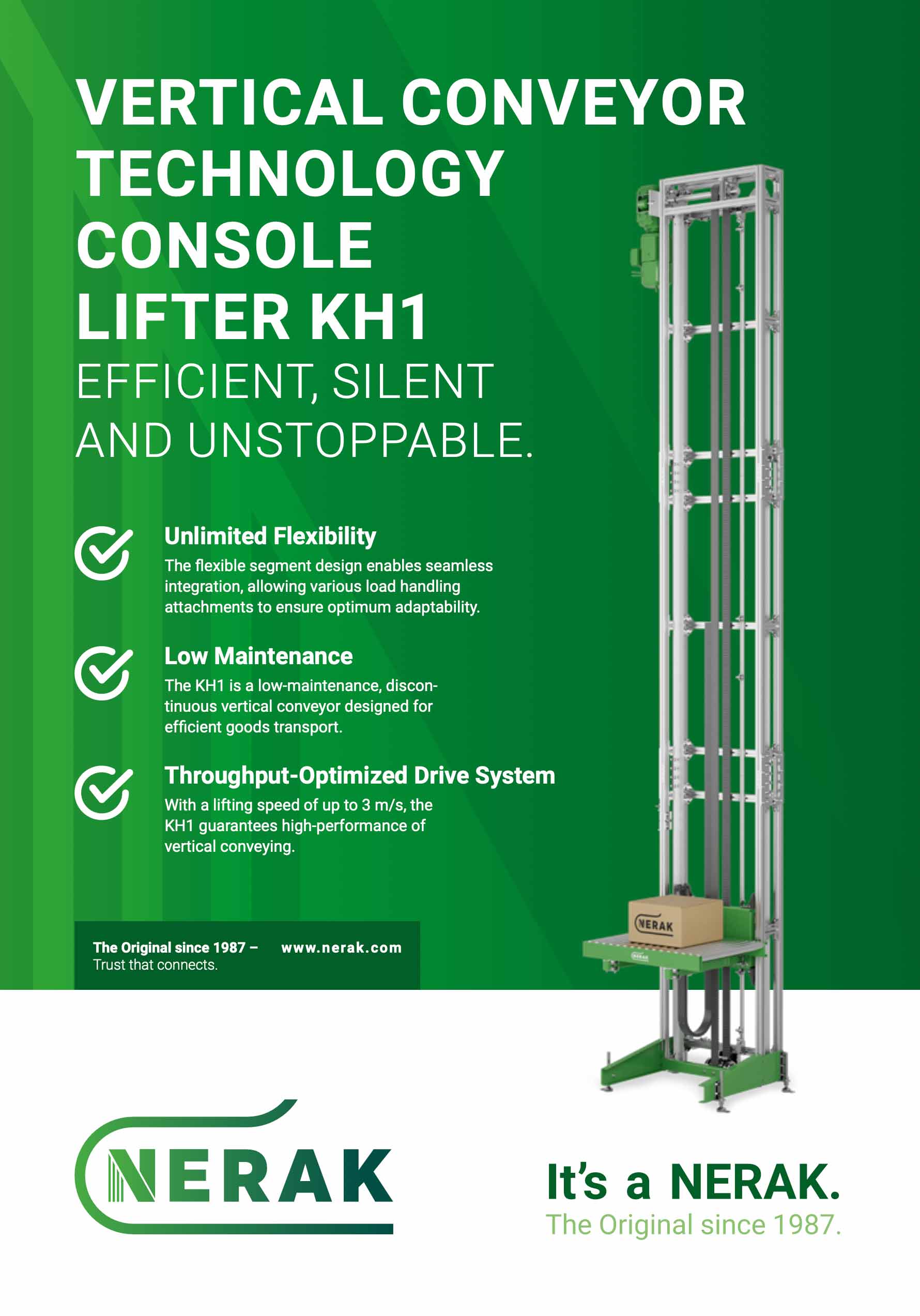 Compact, flexible and powerful: NERAK Reciprocating Lifts create secure connections between multiple levels. We offer tailor-made solutions for precise conveyor performance and impress with modern technology and versatility in every application.
